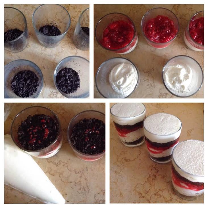 Ora potete comporre i vostri piccoli tiramisù: Versate un cucchiaio di biscotti tritati alla base di ogni bicchiere, mettete la crema aiutandovi con sac a poche, poi i lamponi, altri biscotti e così via.